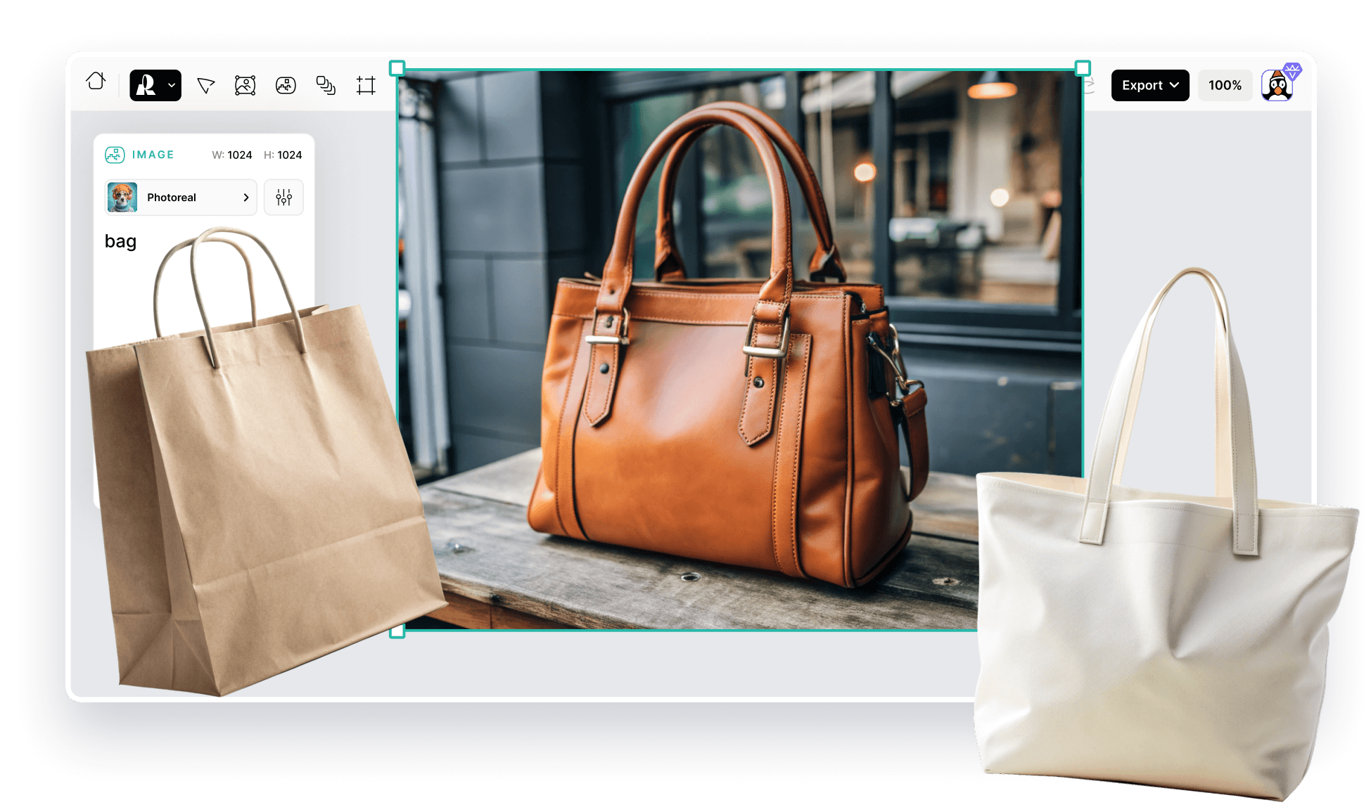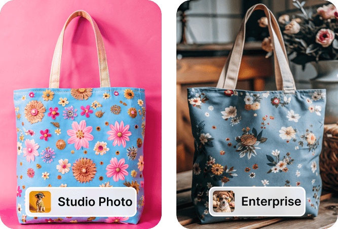 Get proportional, high-resolution results when you generate a tote bag mockup with Recraft. Impress buyers with lifelike bag designs—and save time making them! Our powerful AI technology lets you further enhance image quality and detail in a matter of seconds.